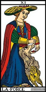 A carta XI retrata o encontro com forças desconhecidas, que tanto libertam quanto aprisionam. Ela também representa o estímulo e a concentração de insights intuitivos que permitem a realização do domínio. A ativação das forças psíquicas e espirituais contra-sexuais também e insinuada. O confronto com as forças destrutivas que põem em risco o desenvolvimento e a transformação das energias caóticas aumenta a força vital.